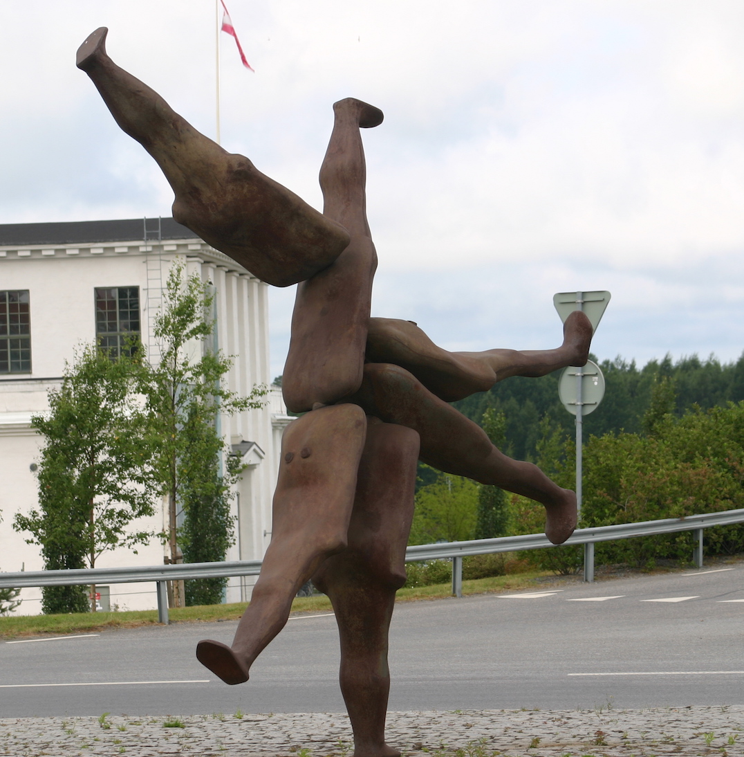 The 3.5-metre-tall sculpture Rhizome II is composed of bodies conveying a spoke-shaped motion, both forwards and backwards. It is placed asymmetrically on the circular roundabout paved with stones, which is itself a part of the artwork.