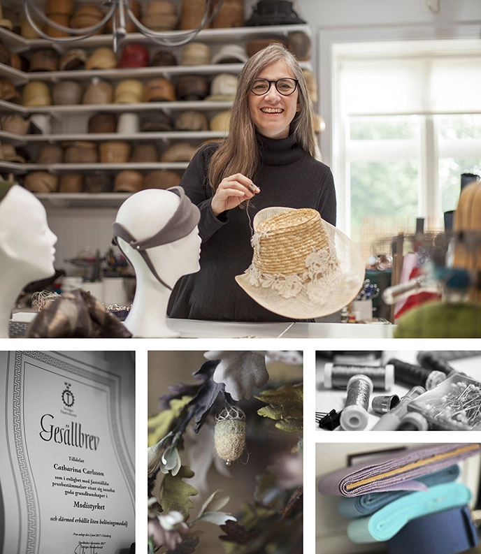 Catharina Carlsson har sin studio i en gammal och charmig industrilokal som är fylld med gjorda hattar för både vardag, fest och scen samtidigt som en av Sveriges största hattstocksamlingar visar att nya alster hela tiden växer fram. Där jobbar hon med både traditionella och experimentella tekniker, som till exempel laserskärare, när hon tillverkar hattar för både vardag och scen.